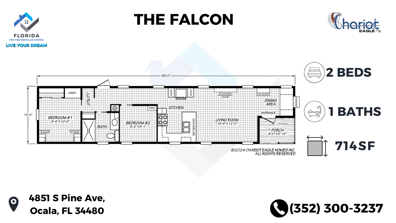 The Falcon by Chariot Eagle, model 13582F, is a thoughtfully designed manufactured home offering 714 square feet of comfortable living space. This single-wide model features two cozy bedrooms and one well-appointed bathroom, making it ideal for small families or couples. The efficient floor plan maximizes every inch of space, ensuring a functional and inviting home environment. With its quality construction and stylish design, The Falcon provides a perfect blend of affordability and modern living.