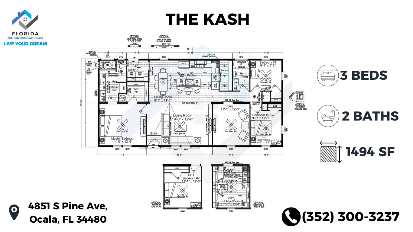 Discover the perfect blend of functionality and style in “The Kash” model home. Spanning 26’8″ by 56′, this residence features an island kitchen and a hidden pantry, elevating culinary experiences to new heights. With the option for a hobby room or 4th bedroom, personalize your space to suit your lifestyle. Indulge in luxury with a 60″ tiled shower in the master bath, complete with a rainfall showerhead, offering a serene retreat right at home.